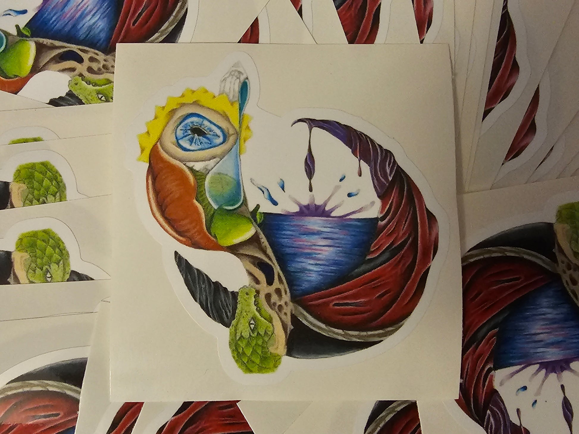 3x3" +/- high gloss BOPP weatherproof stickers! Stick em on your car, water bottle, skateboard or laptop! Really, anywhere you can stick a sticker.